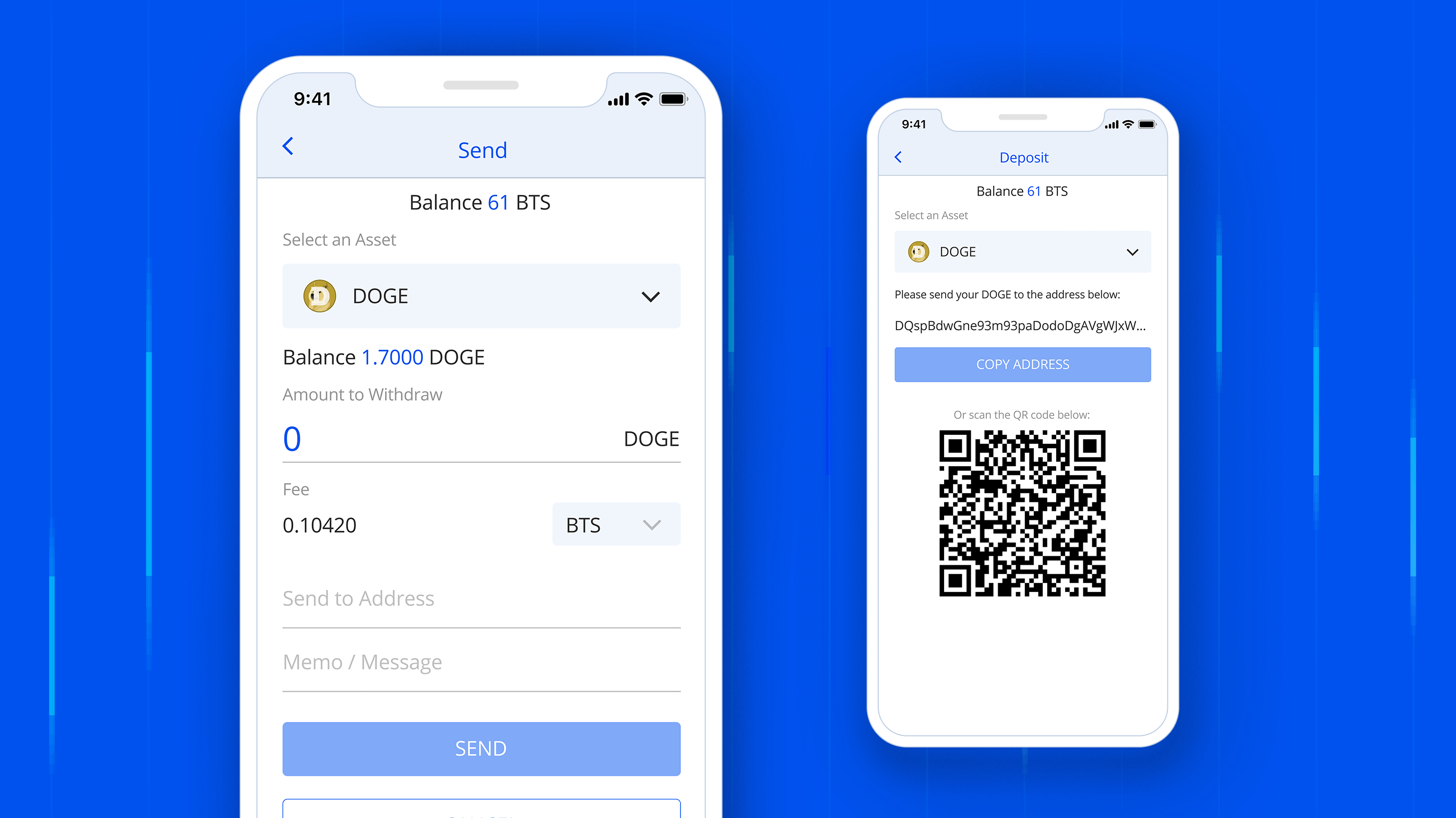 DEX Mobile Wallet allows sending funds almost instantly! To send funds to the particular user, just copy the provided address to the appropriate field or scan an individual QR code.