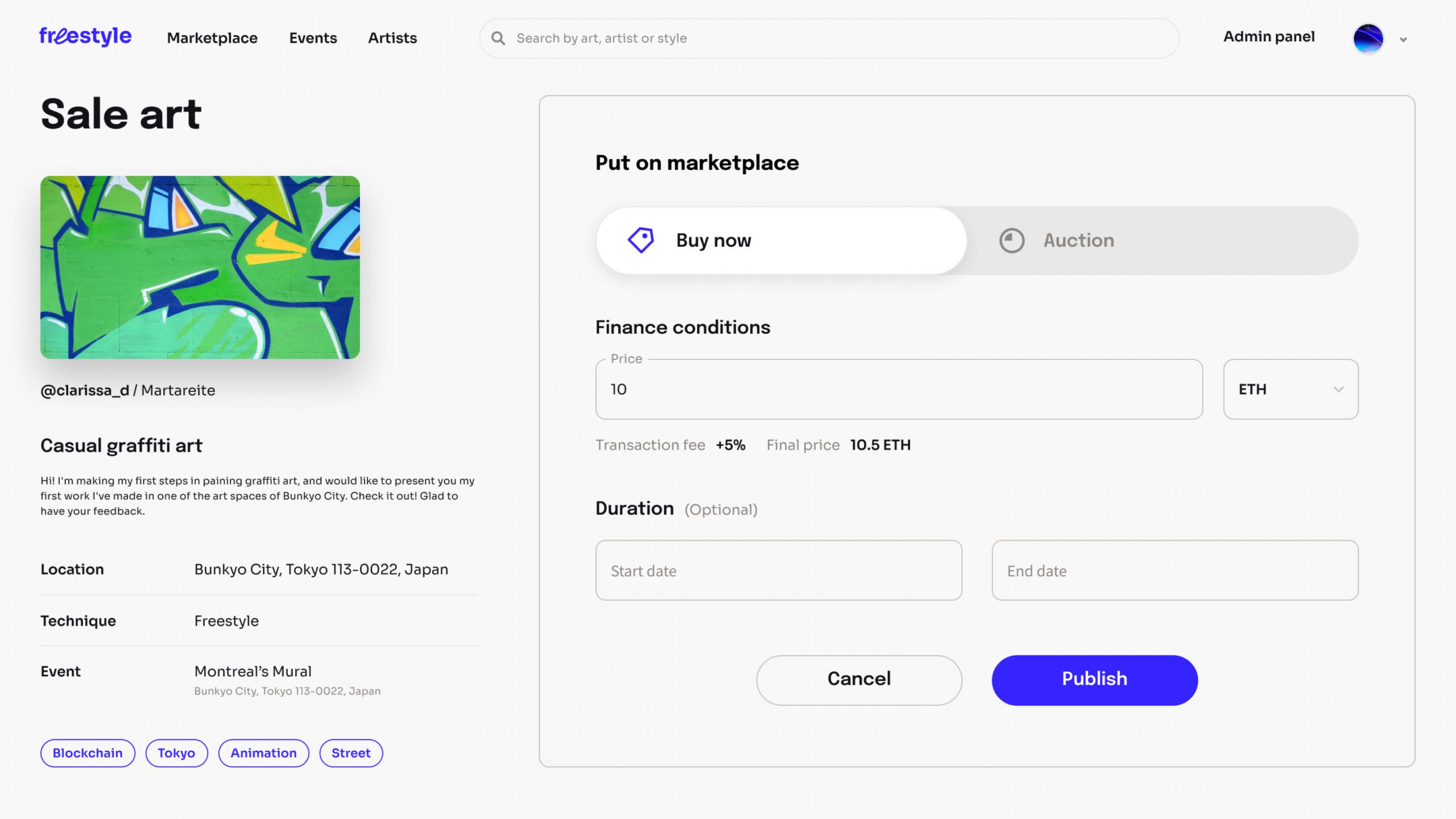 Street artists can publish art on their own or via personal manager’s assistance to sell it on the marketplace in a variety of sale types.