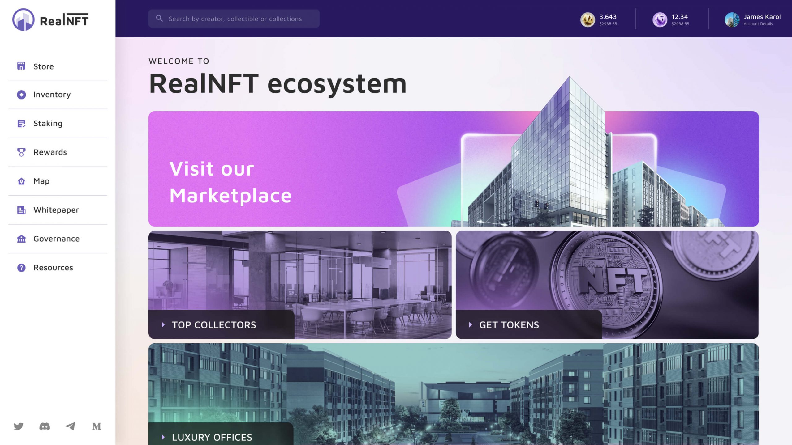 From the platform’s main page, you can quickly navigate to different sections, including your profile, real estate marketplace, your assets catalog, earn tokens, and more.