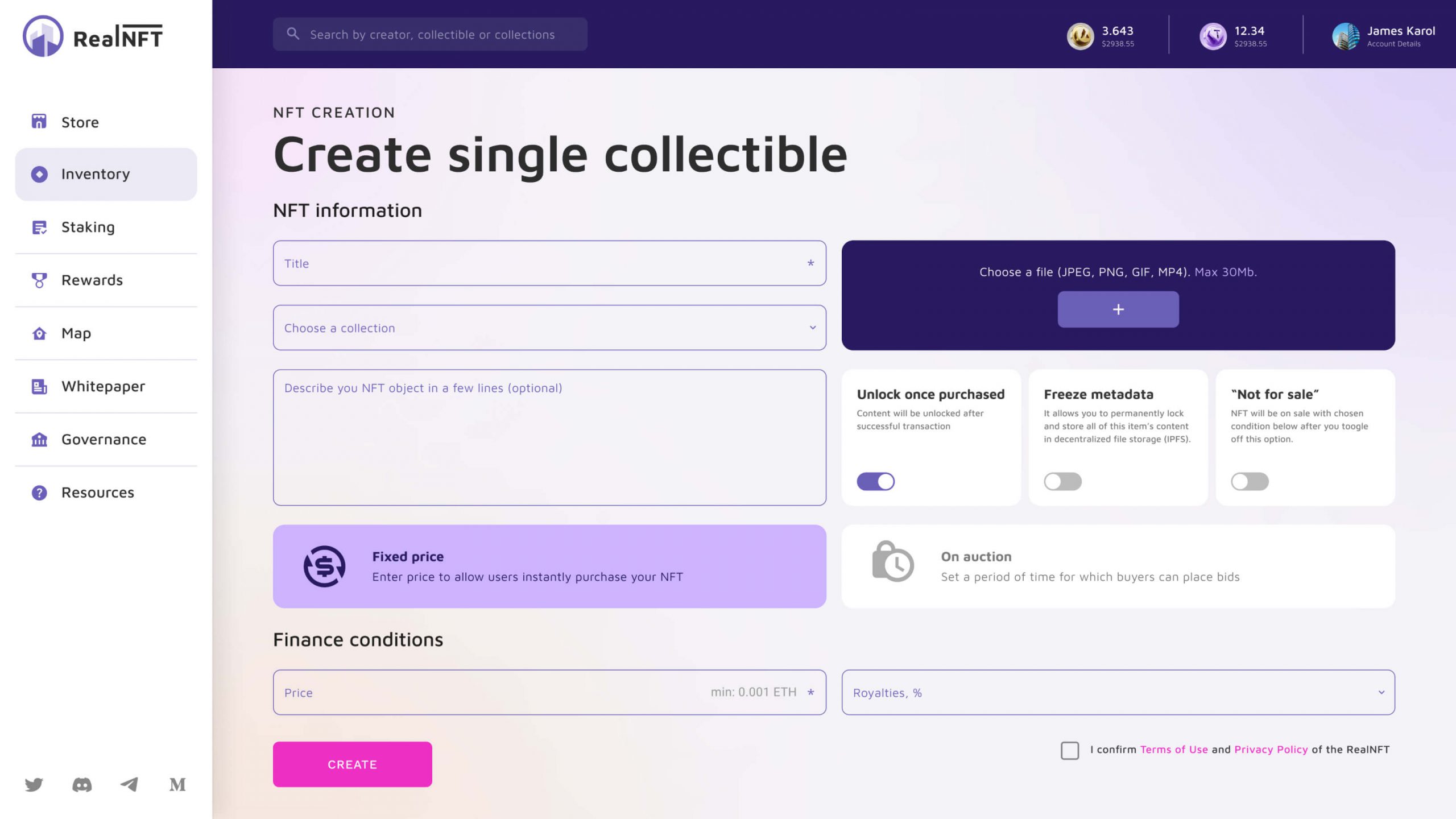 On the marketplace page, click on the item you’re interested in to view its main info, purchase it, or place a bid. Enhanced search features allow quickly finding items by tags. Also, there, you can start selling real estate through NFTs.