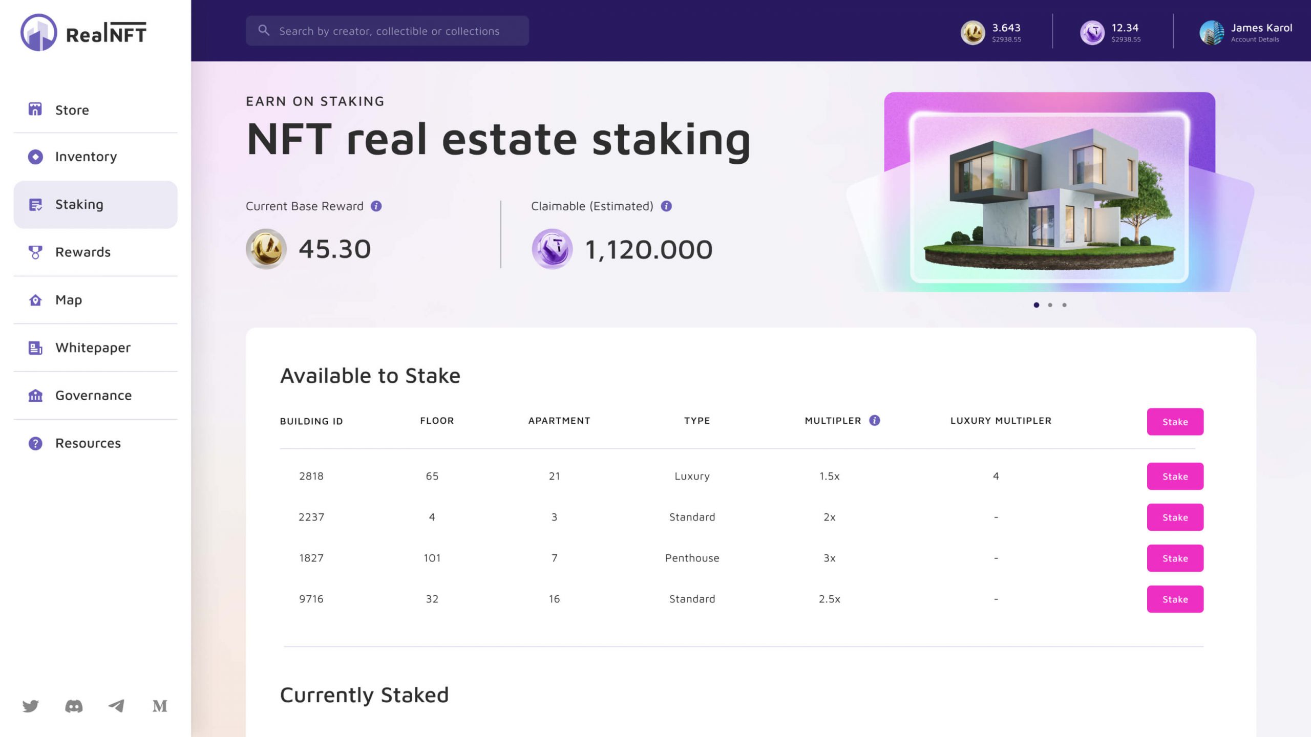 Let users turn their real estate NFTs into ever-growing value by staking them! For staking tokens, they can claim rewards on the dedicated page.